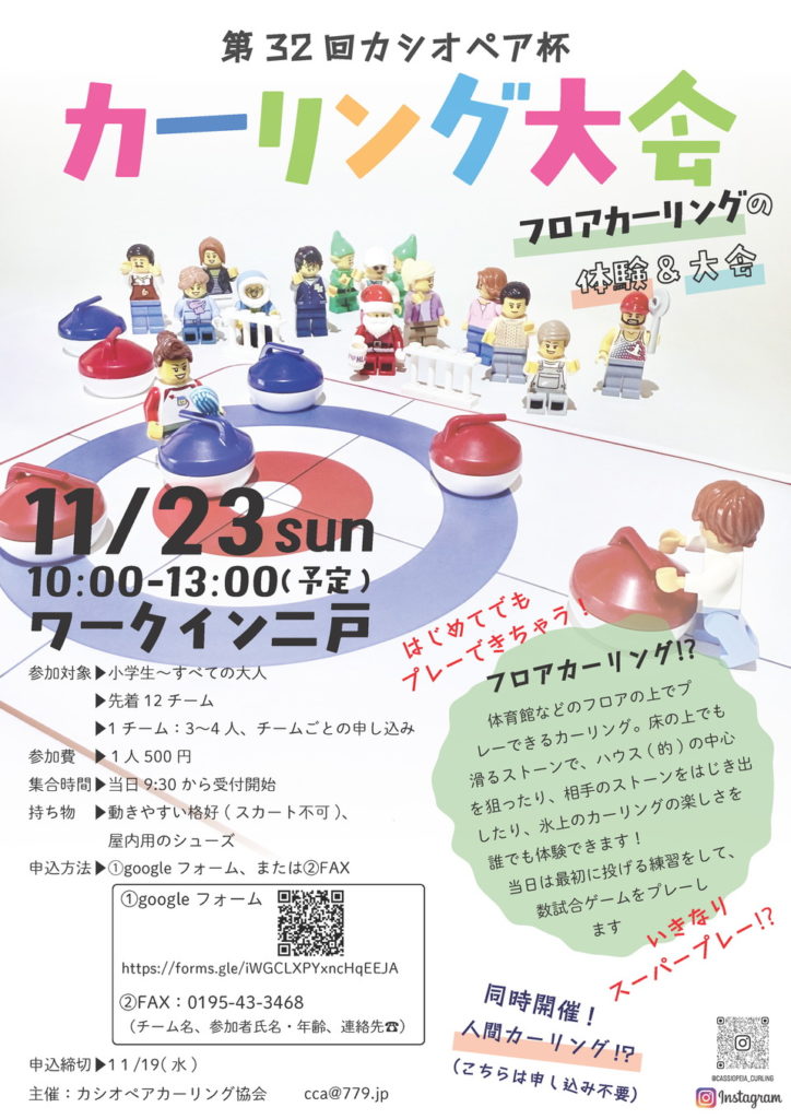 おしらせ 第32回カシオペア杯 カーリング大会🏆 2025年11月12日 2025年11月12日 cassiopeia-curling-Administrator 氷の上じゃなくてもカーリング⁉︎ 誰でもできるフロアカーリング体験&大会開催! 体育館でできるカーリング!初めてでもすぐ試合できちゃう! 友だちや家族で楽しくスーパープレーを決めよう!参加者募集中です♪ 【日時】11月23日(日) 10時~13時(予定)【会場】ワークイン二戸【参加対象】小学生~すべての大人【参加費】1人500円【持ち物】動きやすい服装(スカート不可)、屋内用の靴 ↓申込はこちらから↓参加申し込みフォーム